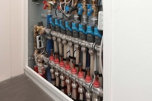 Die Heizwärme wird über eine flächendeckende Fußbodenheizung verteilt, deren Regelung direkt an den Einzelraum gekoppelt ist. Voreingestellte dynamische Ventile übernehmen den hydraulischen Abgleich automatisch ohne zeitraubendes Messen und manuelles Justieren vor Ort. Das erleichtert die Installation, verkürzt die Bauzeit und minimiert Reklamationen im Betrieb.