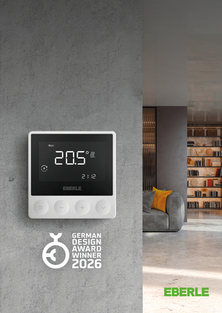 Mit dem ATR 4000 bietet EBERLE einen digitalen Aufputz-Temperaturregler mit minimalistischem, zeitlosem Design, intuitiver Bedienung und energieeffizienter Regelung. Bei 21 mm Aufbauhöhe und kompaktem 86×86-mm-Format lässt sich der Regler dezent in unterschiedliche Raumumgebungen integrieren. Das große, hintergrundbeleuchtete Display (schwarz/weiß) unterstützt eine gute Lesbarkeit. Der ATR 4000 verfügt über Funktionen wie Fenster-Offen-Erkennung, Optimum-Start, Eco-/Party-Betrieb sowie Ventil- und Frostschutz. Der geräuschlose Triac-Ausgang eignet sich besonders zur Ansteuerung von Stellantrieben und Ventilen in wassergeführten Heiz- und Kühlsystemen. Verfügbar ist der Regler als ATR 4500 (Heizen/Kühlen) und als ATR 4800 Advanced mit Wochenprogrammen, Urlaubs-/Zuhause-Modus und optionaler 16-A-Erweiterung über den Unterputz-Puck UPP 16. Beide Varianten erfüllen die Anforderungen der EU-Ecodesign-Richtlinie LOT20. Für das Produktdesign wurde der ATR 4000 mit dem German Design Award 2026 („Winner“) in der Kategorie „Excellent Product Design – Building and Elements“ ausgezeichnet.