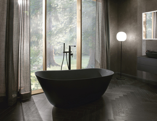 Am dunkleren Ende des Farbspektrums steht „Tiefe Balance“ für ruhige, sinnliche Intensität. Inspiriert von Licht- und Wasserreflexionen spielt dieser Trend mit Tiefe, Tonalität und Materialwirkung. Dunkle, fließende Nuancen – von Mitternachtsblau über tiefes Blaugrün und Graphitgrau bis zu weichem Schwarz – verleihen dem Badezimmer eine kontemplative, elegante Ausstrahlung. In Kombination mit samtmatten Oberflächen, präzisen Konturen und minimalistischen Formen entstehen Räume, die nicht kühl oder dramatisch wirken, sondern atmosphärisch und harmonisch. Bei Villeroy & Boch und Ideal Standard spielt das Licht eine zentrale Rolle: Es betont Tiefe und Handwerkskunst jedes Elements.