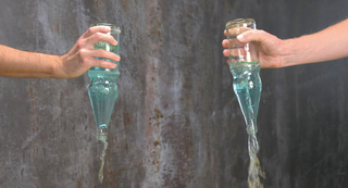 Das Prinzip der durchgehenden Luftsäule mittels Rotationsbeschleunigung, einfach erklärt anhand eines Versuchs mit zwei gefüllten Wasserflaschen: Durch Schwenken der Flasche entsteht eine sichtbare Luftsäule, der Ausströmvolumenstrom erhöht sich deutlich.