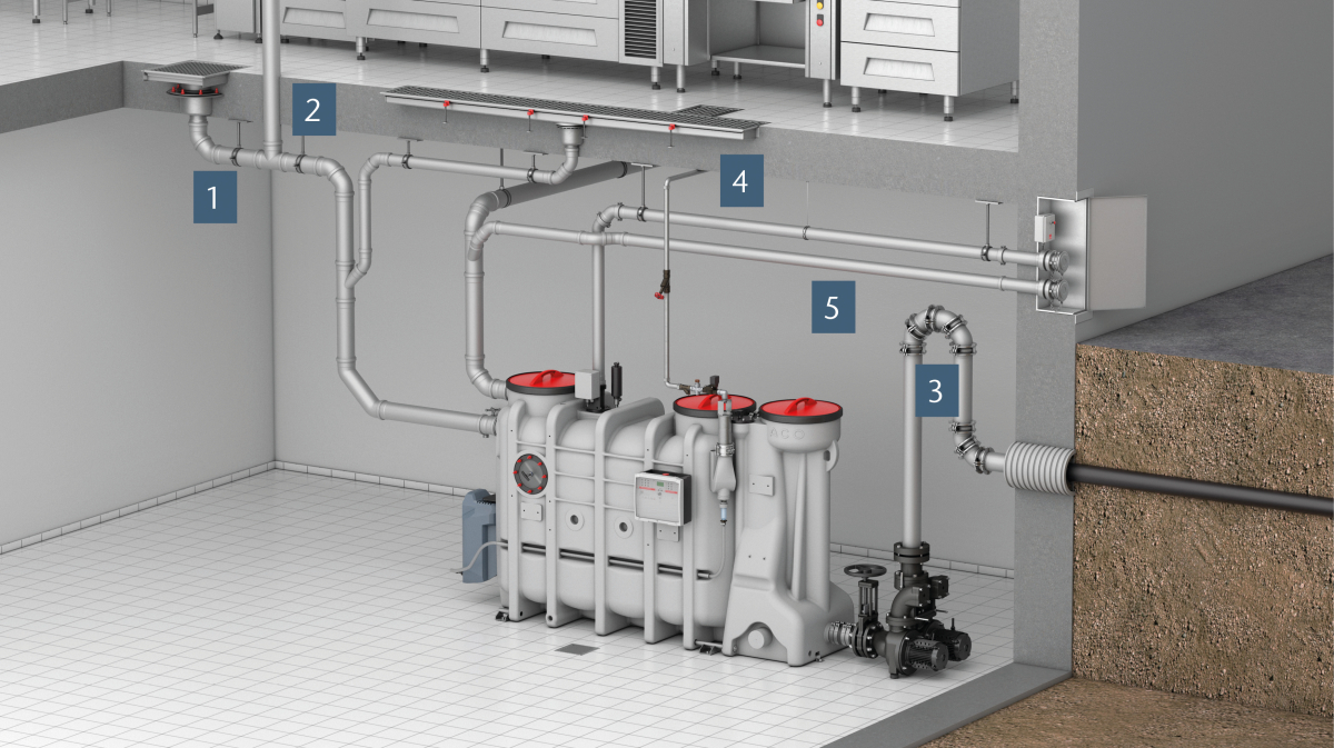 Das Abwasser aus gewerblichen Küchen wird direkt über Zulaufleitungen (siehe (1) im Bild oben) mit dem Fettabscheider verbunden. Zur normativ richtigen Installation müssen diese Zulaufleitungen über eine separate Lüftungsleitung (siehe (2) im Bild oben) verfügen. Abhängig von den bauseitigen Gegebenheiten ist das vorbehandelte Abwasser aus dem Ablauf des Fettabscheiders über eine zu einer Hebeanlage gehörenden Druckleitung (siehe (3) im Bild oben) in die öffentliche Kanalisation abzuschlagen. Werden Fettabscheider mit Entsorgungsanschlüssen verbaut, so empfiehlt sich die Montage einer Entsorgungsleitung (siehe (4) im Bild oben). Als Ergänzung zur Entsorgungsleitung kann planerisch zusätzlich eine Pendelgasleitung (siehe (5) im Bild oben) mit passendem Anschluss für das Entsorgungsfahrzeug vorgesehen werden.