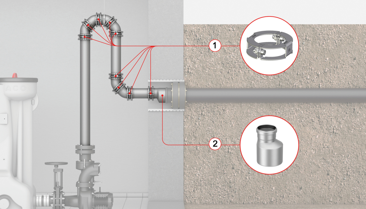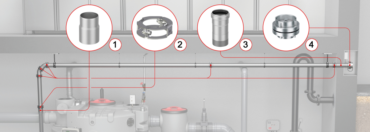 Entsorgungsleitung eines Fettabscheiders, beispielhaft dargestellt mit „Aco Pipe“-Edelstahlrohr, Material 1.4404: (1) Übergänge am Entsorgungsanschluss, (2) Druckrohrschellen, (3) Übergänge am Übergabepunkt zum (4) Entsorgungsanschluss.