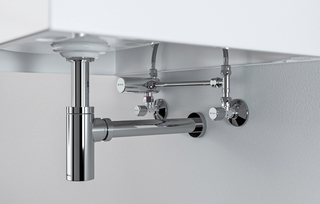 Abb. 2: Bei allen elektronischen Armaturen sind Warm- und Kaltwasser unmittelbar miteinander verbunden. Somit benötigen sie zum Schutz gegen Überströmung (von warm nach kalt und umgekehrt) immer funktionsfähige Rückflussverhinderer vom Typ EB. Vor der Probennahme muss grundsätzlich eines der Eckventile geschlossen werden, damit kein Mischwasser beprobt wird.