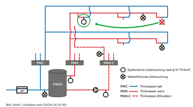 Um jeweils ein vollständiges Bild der Trinkwasserinstallation zu erhalten, müssen die systemischen Untersuchungen am Austritt des Trinkwassererwärmers, im Rücklauf der Zirkulation und an peripheren Entnahmestellen im Gebäude grundsätzlich am selben Tag erfolgen. Dies gilt auch für weitergehende Untersuchungen oder Nachbeprobungen von einzelnen Entnahmestellen: Auch dann sind grundsätzlich nicht nur einzelne Entnahmestellen, sondern auch diese zentralen Stellen erneut mit zu beproben.