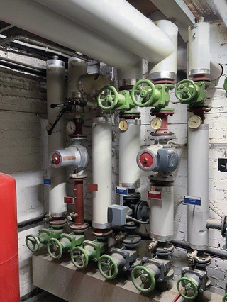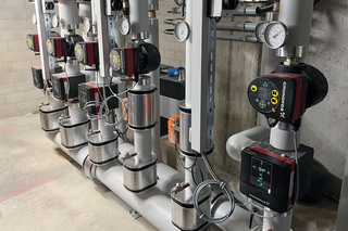 Hauptmaßnahme bei der Modernisierung war die Erneuerung von Hydraulik und Regelung im Spätsommer und Herbst 2023. Insgesamt wurden die Hauptverteilung und rund 20 Regelkreise erneuert. In den meisten Kreisen kam dabei die Mischkreislösung „Grundfos Mixit“ zum Einsatz. Diese basiert auf einem neuartigen Konzept, bei dem alle wesentlichen Komponenten des Mischkreises, also Ventile, Schrittmotor, Sensoren und eine intelligente Temperaturregelung, in eine kompakte Regeleinheit integriert sind. Die Regeleinheit stellt über 100 Datenpunkte für die Überwachung und Optimierung des Anlagenbetriebs zur Verfügung. Genutzt werden können sie entweder über die Leittechnik oder ohne Leittechnik über die Cloudlösung „Grundfos Connect“. Die erforderlichen Schnittstellen hat die Regeleinheit bereits an Bord.