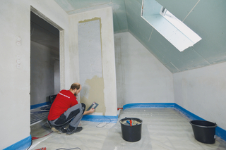 Verlegung einer elektrischen Wandheizung auf Basis einer Carbonfolie.
