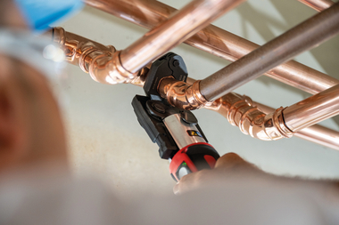 Enge Einbausituationen stellen Installateure vor Herausforderungen: An Sockelleisten, bei der Überkopf-Montage oder bei T-Stück-Abgängen an Wand und Decke kann das Presswerkzeug nur in bestimmten Winkeln angesetzt werden – das kostet Kraft und Zeit. Damit auch an schwer zugänglichen Stellen schnell und sauber gearbeitet werden kann, hat Fränkische seine Pressbacke angepasst. Die optimierte Pressbacke mit F-Kontur ist in den Dimensionen 16 und 20 mm erhältlich und für die meisten Pressmaschinen geeignet. Die „alpex F50 Profi Fittings“ lassen sich einfach verarbeiten: Nach dem Ablängen mit dem Rohrabschneider kalibriert und entgratet der Handwerker das Ende des Rohres. Der Grundkörper wird in das Rohr eingeschoben, fixiert und der Sitz durch das Sichtfenster im Fixierring kontrolliert. Abschließend werden Rohr und Formteil mit dem Presswerkzeug verpresst.