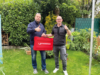 Vollauf zufrieden: Frank Maurer aus Riedstadt bekam von Rothenberger-Außendienstmitarbeiter Alexander Heeb (rechts) das All-in-One-Dichtheitsprüfgerät „ROTEST AIR“ zum Praxistest.