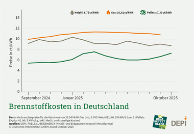 Im Vergleich zu Erdgas liegt der Preisvorteil bei rund 32 Prozent. Zu Heizöl beträgt der Preisvorteil aktuell 16,3 Prozent. „Erfahrungsgemäß steigt der Preis mit Beginn der Heizperiode. Wer...
