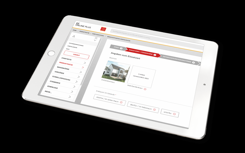 Die GC Gruppe bietet mit dem Abwasserpumpen-Konfigurator in GC Online Plus den ersten herstellerübergreifenden Konfigurator im Bereich der Abwassertechnik. In nur drei Schritten legt der neue Konfigurator die richtige Abwasserpumpe oder Hebeanlage für fäkalienfreies und fäkalienhaltiges Wasser für das Einfamilienhaus aus. Das spart Zeit und sorgt für sicheres und passgenaues Arbeiten. Ein intelligentes digitales Werkzeug für alle Profis, die regelmäßig oder nur ab und zu in diesem Bereich unterwegs sind.