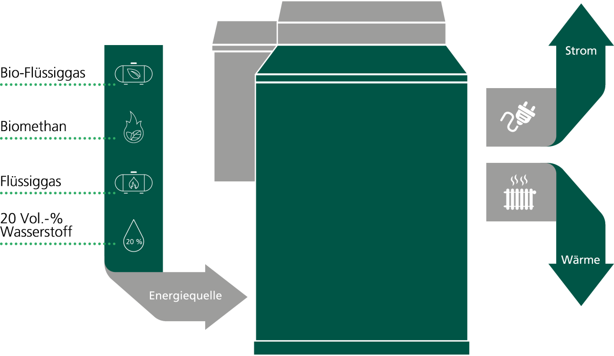 Neben klassischem Erdgas kann der Dachs auch mit Biomethan, (Bio-)Flüssiggas und bis zu 20 Volumenprozent Wasserstoff betrieben werden. Flüssiggas ist eine etablierte Alternative zum Erdgas.