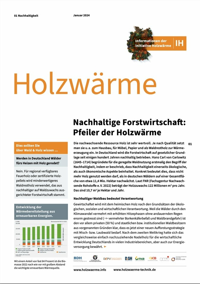 14.03.2024Mit einer Reihe von Fact Sheets will die Initiative Holzwärme (IH) kontinuierlich über die vielschichtigen Vorteile der Wärmeerzeugung mit Holz informieren. Die erste Ausgabe mit dem Titel „Nachhaltige Forstwirtschaft: Pfeiler der Holzwärme“ ist jetzt erschienen und auf der IH-Website im Servicebereich verfügbar. „Nachhaltig erzeugte Holzwärme spielt im Energie-Mix in Deutschland eine wichtige Rolle, die Nachfrage nach sachlich fundierten Informationen ist enorm“, sagt IH-Sprecher Andreas Lücke.