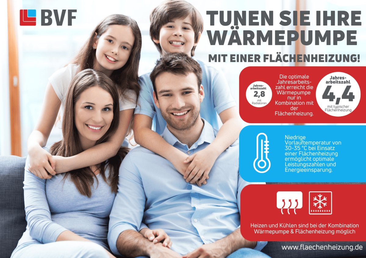 Eine Flächenheizung soll mehr als nur eine gleichmäßige Wärmeverteilung bieten – sie ist die Basis, um die Effizienz und Wirtschaftlichkeit einer Wärmepumpe voll auszuschöpfen und die Energiekosten langfristig zu senken, so der BVF. Durch das Zusammenspiel mit regenerativer Energie aus Photovoltaik- oder Windanlagen lässt sich der Heiz- und Kühlbedarf zu einem Großteil umweltschonend decken. Auch für Bestandsgebäude ist die Nachrüstung mit Flächenheizung und Wärmepumpe möglich, um diese effizient und zukunftssicher zu machen.