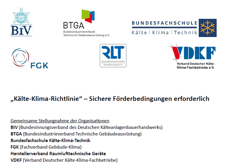 Im Statement werden Finanzierungsprobleme der Branche beim Ausbleiben von Fördermitteln genannt, da viele Betreiber Projekte bereits geplant haben, bei denen die Förderung wichtiger Bestandteil des Finanzierungskonzepts ist. Der erlassene Bewilligungsstopp des Bundesfinanzministeriums betrifft die Zuwendungsbescheide des Bundesamts für Wirtschaft und Ausfuhrkontrolle (BAFA) ab 2024, worunter auch die Kälte-Klima-Richtlinie fällt. Hinzu kommt die novellierte und verschärfte europäische F-Gase-Verordnung.