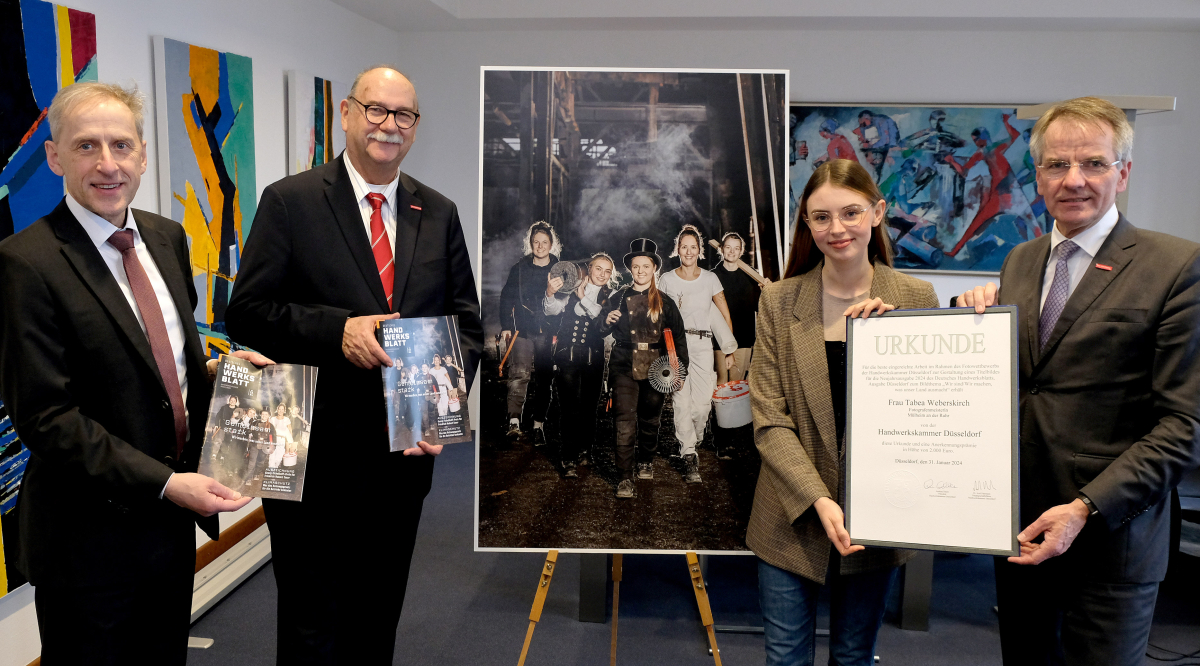 Die herausragende Arbeit der 24-Jährigen zeigt fünf vom anstehenden Tagwerk beseelte Junghandwerkerinnen aus unterschiedlichen technischen Gewerken in Berufskluft, mit einschlägigem Werkzeug oder Baumaterial unter Arm, in einem Industrie-Ambiente und offensichtlich auf dem Weg zu einem gemeinsamen Einsatzort. „Tabea Weberskirch ist nach einhelliger Beurteilung der Juroren exakt das gelungen, was wir uns gewünscht hatten: Mit einer brillanten kompositorischen Idee und in technisch hochwertiger Umsetzung das Kommunikationsjahr 2024 fürs regionale Handwerk mit einem selbstbewussten Bild zu eröffnen, das den Wirtschaftsbereich im Zentrum unserer Gesellschaft zeigt,“ würdigte Ehlert die Leistung der Fotografin und Jungunternehmerin, bevor er Weberskirch die Siegesurkunde und eine Anerkennungsprämie in Höhe von 2.000 € aushändigte; die Auszeichnung erfolgte während der Jahresauftakttagung des Kammervorstands am Mittwoch in Düsseldorf.