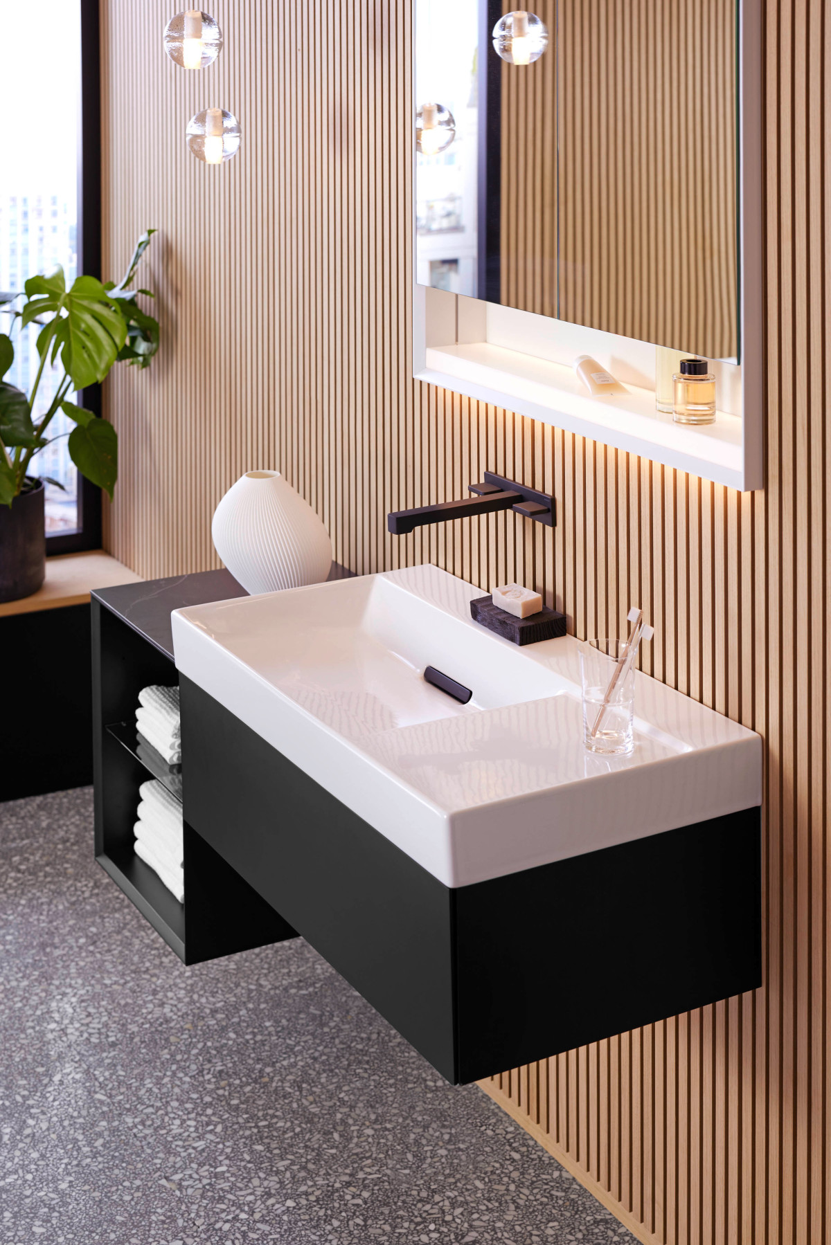 Seit der Sortimentserweiterung 2022 umfasst die Komplettbadserie Geberit „One“ Möbel in der Farbe Schwarz matt, 2023 kommen weitere Produkte dazu: Unter anderem gibt es die Unterputzvariante des Geberit „One“-Spiegelschranks neben den Farben Weiß pulverbeschichtet und Aluminium eloxiert auch in Schwarz matt. Auch die Waschtischarmatur der Serie wird in schwarz matter Ausführung erhältlich sein. Für eine farblich harmonische Waschplatzgestaltung gibt es passend dazu auch die Blende des horizontalen Waschtischablaufs in Schwarz matt, zusätzlich zu den bisherigen Farbvarianten Weiß, Hochglanz verchromt und Chrom gebürstet.
