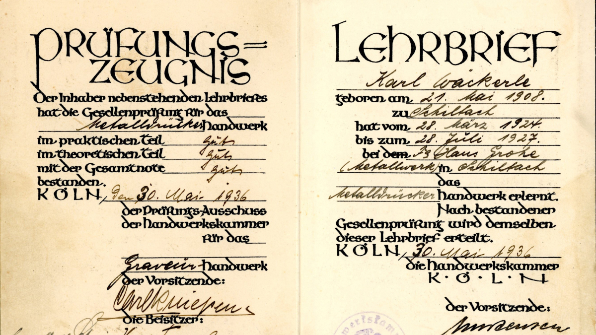 Der erste bei Hansgrohe dokumentierte Lehrbrief stammt von Karl Wäckerle. Er erlernte von 1924 bis 1926 in Schiltach den Beruf des Metalldrückers.