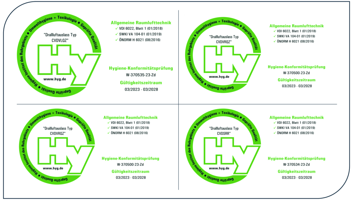 Hygienezertifikate für Cosmo-Deckenluftdurchlässe