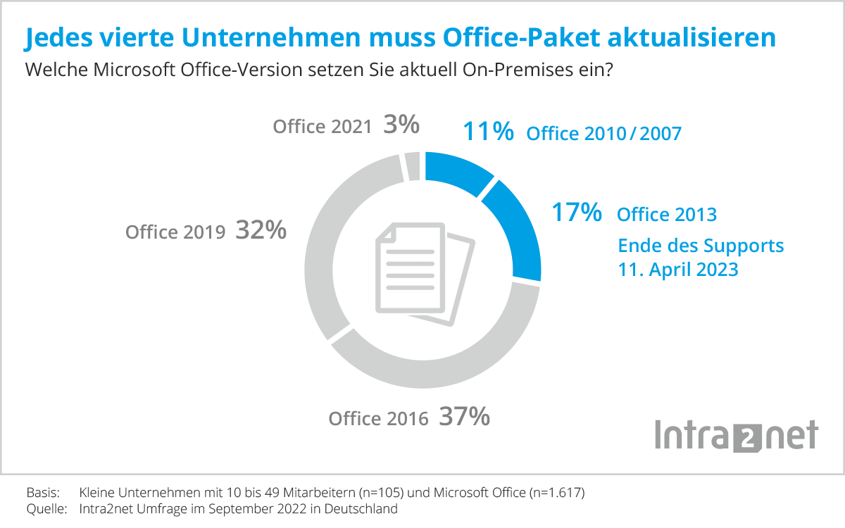 Bereits veraltete Office-Versionen wie Office 2010 und Office 2007 werden noch auf 11 % der Arbeitsplätze in kleinen Unternehmen genutzt. Für beide Lösungen werden seit Längerem keinerlei Sicherheitsaktualisierungen mehr bereitgestellt. Office 2013 kommt auf einen Marktanteil von 17 %. Der erweiterte Herstellersupport von Microsoft für das vor rund zehn Jahren veröffentlichte Office-Paket endet am 11. April 2023.