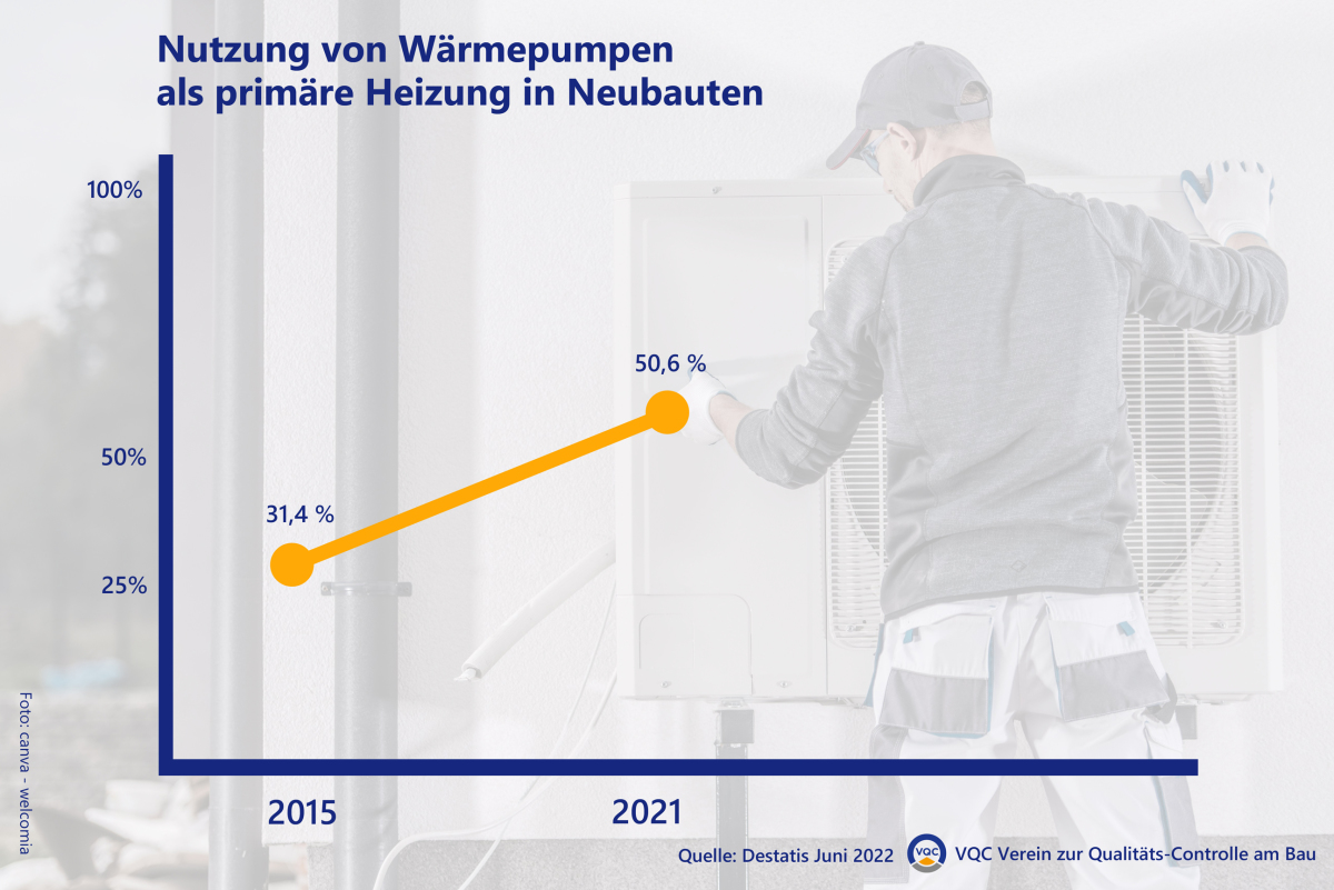 Als primäre, also überwiegend für das Heizen eingesetzte Energiequelle werden erneuerbare Energien in mehr als der Hälfte (55,1 %) der 102 955 im Jahr 2021 fertiggestellten Wohngebäude eingesetzt (2015: 38,0 %). Meist handelt es sich um Wärmepumpen: Sie kommen in 50,6 % der Neubauten als primäre Heizung zum Einsatz. Zum Vergleich: 2015 waren es noch 31,4 %. Der Verein zur Qualitäts-Controlle am Bau e.V. (Göttingen) weist darauf hin, dass bei diesen neuen Heiztechnologien eine besonders sorgfältige Bauausführung des Neubaus nötig sei, da ansonsten die Heizleistung in manchen Situationen nicht ausreichen könne.