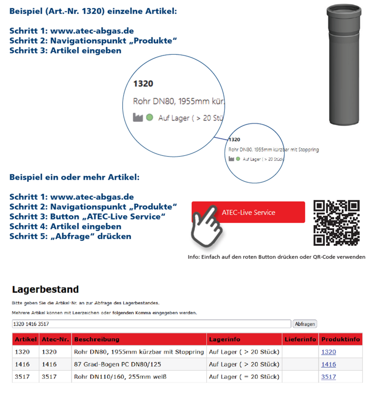 Ob am PC im Büro oder am Smartphone vor Ort auf der Baustelle, ganz gleich zu welcher Uhrzeit. Dafür muss man nur auf www.atec-abgas.de/produkte den gesuchten Artikel auswählen. Sofort wird angezeigt, ob und in welcher Menge er auf Lager liegt oder wie andernfalls die Lieferzeit ausfällt.