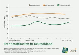 20.10.2025Im Oktober steigt der Holzpelletpreis wie üblich dem Saisonverlauf: So kostet eine Tonne Pellets laut Zahlen des Deutschen Pelletinstituts (DEPI) im Durchschnitt 366,25 Euro bei 6 t Abnahmemenge. Die Kilowattstunde klimafreundliche Holzenergie kostet zum aktuellen Zeitpunkt 7,33 Cent. Das sind 9,3 Prozent mehr als im Vormonat.
