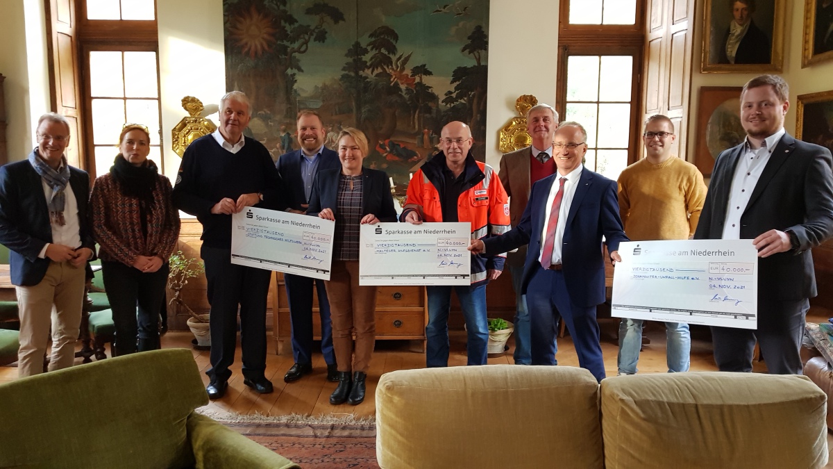 Christine Roßkothen (Heinz Trox-Stiftung) und Thomas Mosbacher (Geschäftsführung Trox GmbH) überreichten die Spenden an Repräsentanten des Technischen Hilfswerks, des Malteser Hilfsdienstes sowie der Johanniter-Unfall-Hilfe zweckgebunden für die Unterstützung der Flutopfer.
