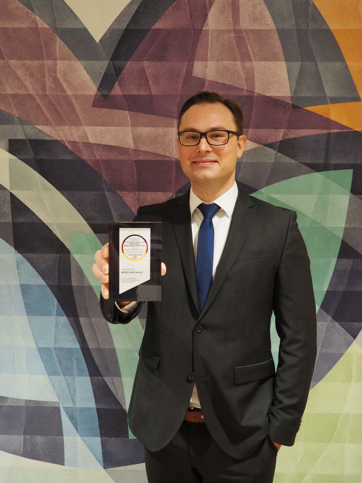 Philipp Lehmkuhl, Leiter Digitale Transformation & Unternehmensanalysen, nahm für MEWA den „Deutschen Exzellenzpreis für Strategie, Transformation & New Work“ entgegen