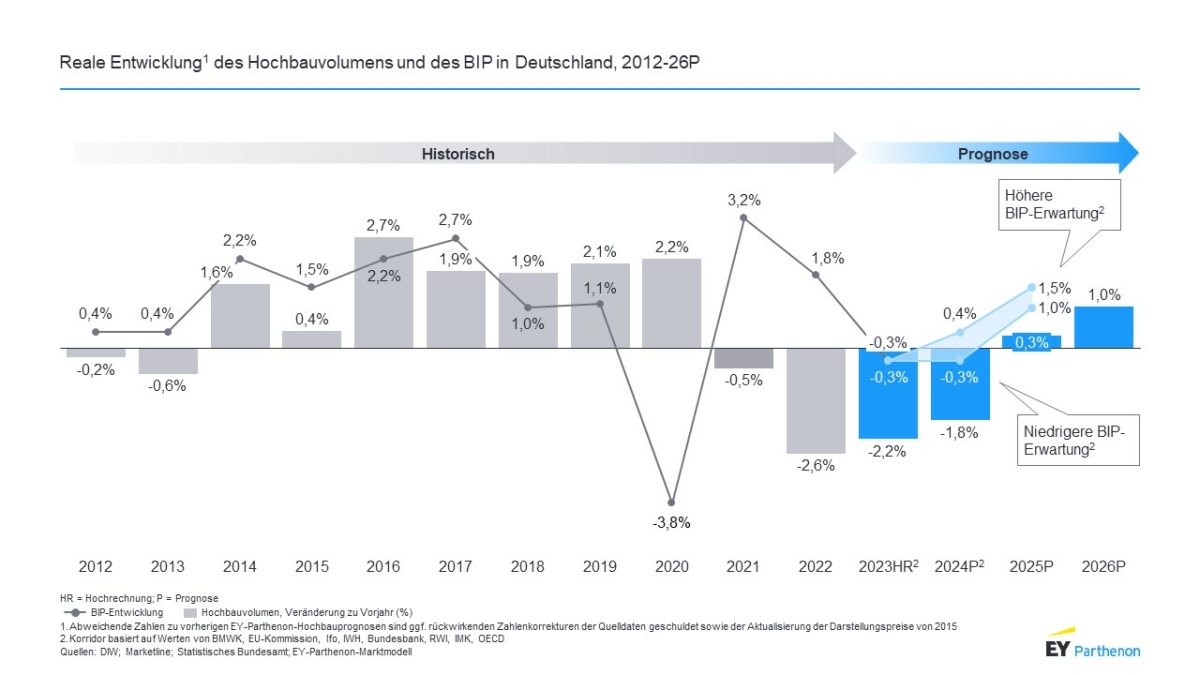 31.07.2024Der deutsche Hochbau wird sich wohl erst im Jahr 2025 stabilisieren, prognostiziert die Strategieberatung EY-Parthenon (www.ey.com/de/parthenon) in einer heute (23.7.2024) veröffentlichten Studie. Nach dem Einbruch des realen Bauvolumens im vergangenen Jahr um 2,2 % wird für 2024 ein weiterer Rückgang erwartet, der mit -1,8 % allerdings ein wenig geringer ausfällt. Stark gestiegene Baukosten und Zinsen, die angespannte gesamtwirtschaftliche Lage und das regulatorische Umfeld lassen viele Bauherren und Investoren abwarten. Erst im Jahr 2025 scheint die Stabilisierung mit einer geringen Marktzunahme von 0,3 % in Aussicht zu stehen – gestützt von Renovierungs- und Instandhaltungsmaßnahmen. Für das Jahr 2026 rechnen die Berater dann wieder mit einem leichten Volumenwachstum von 1,0 %. Das Vor-Pandemie-Niveau, das durch ein historisch niedriges Zinsniveau begünstigt wurde, dürfte allerdings vorerst nicht erreicht werden.