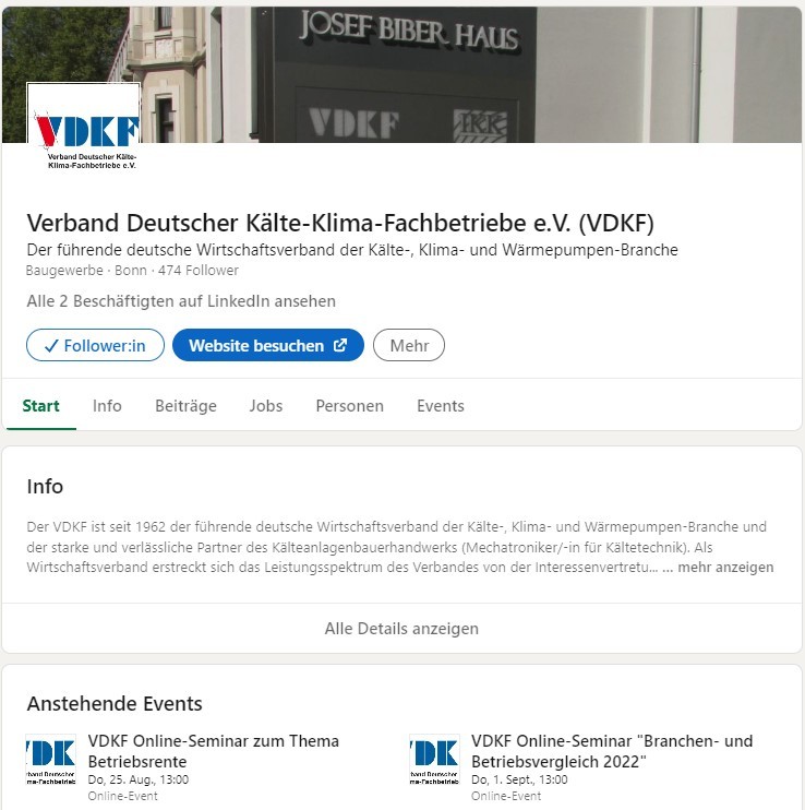 Der VDKF (Verband Deutscher Kälte-Klima-Fachbetriebe e.V.) ist seit Kurzem mit eigenen Seiten auf den Social-Media-Plattformen LinkedIn und Facebook aktiv. Neben den Meldungen, die der VDKF über seine Verbandszeitschrift „VDKF Information“, seine Newsletter „VDKF Direkt“ und die eigene Webseite (www.vdkf.de) verbreitet, ergänzen die neuen Social Media-Seiten die bisherigen Medienkanäle des Verbands. Der Dialog mit seinen Mitgliedern und anderen Vertretern der Branche ist dem VDKF sehr wichtig. Über die sozialen Netzwerke eröffnen sich beiden Seiten neue Möglichkeiten der direkten und zeitnahen Kommunikation.