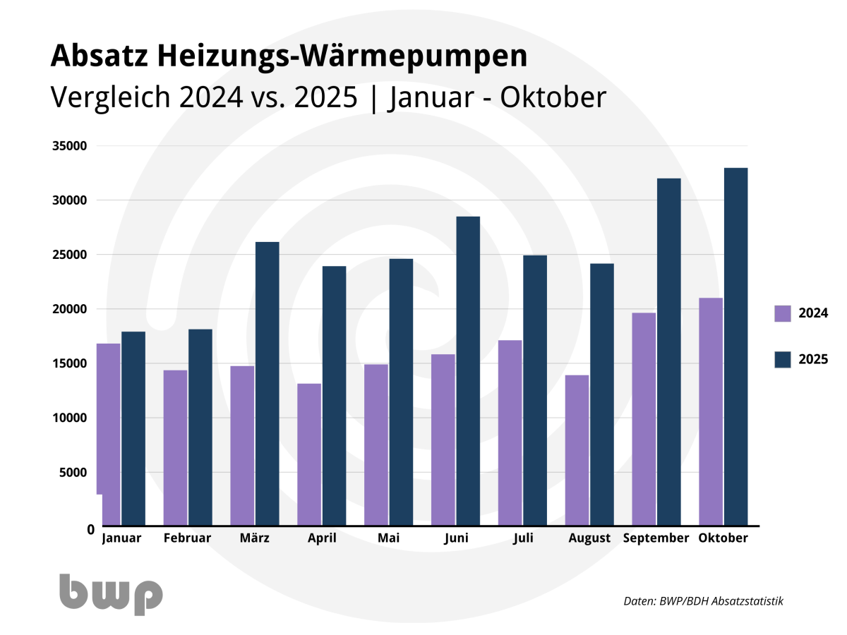 Die Absatzzahlen der Heizungs-Wärmepumpen von Januar bis Oktober 2024 und 2025 – im September und Oktober wurden mehr als 30.000 Wärmepumpen abgesetzt.