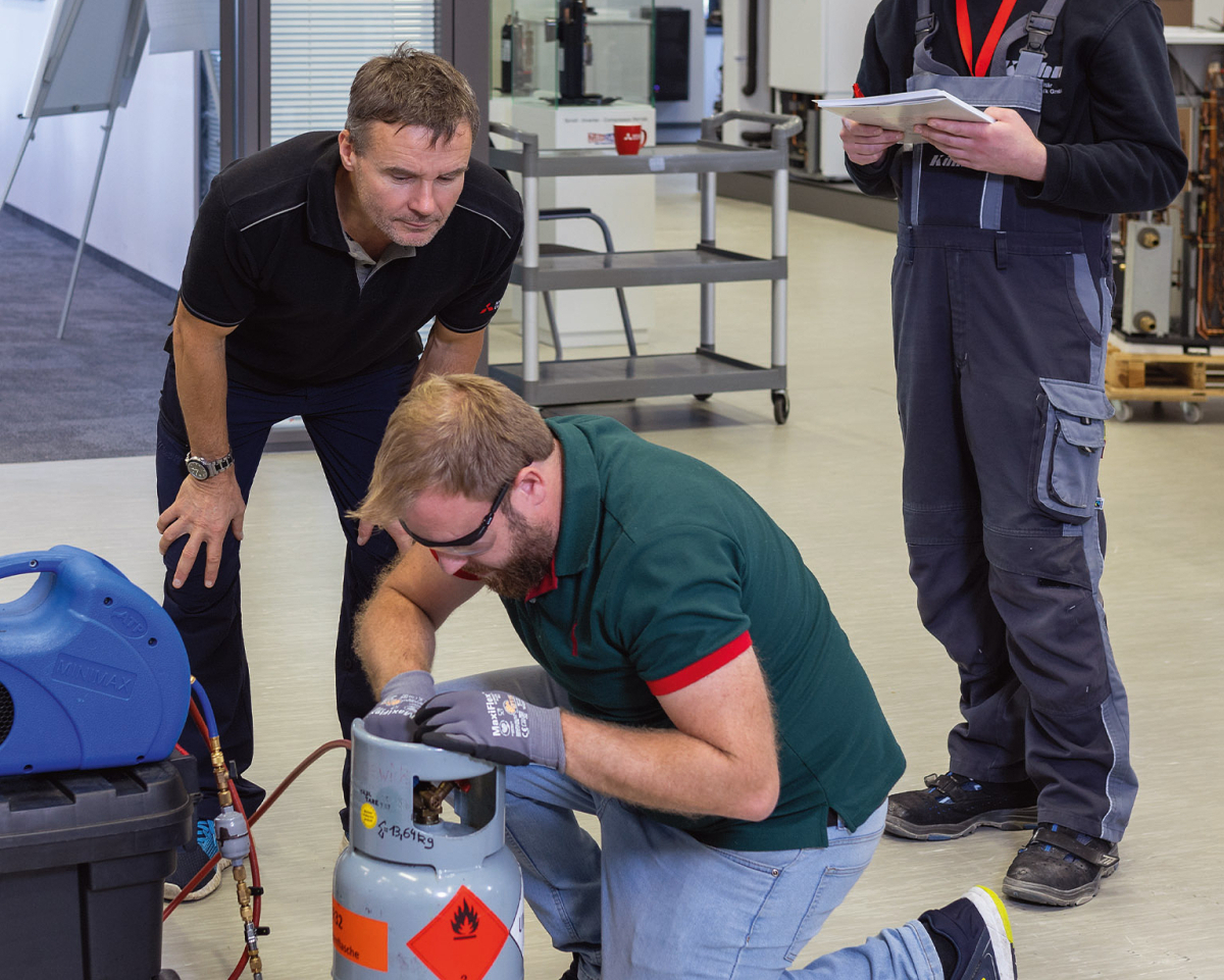 In separaten Planungstrainings wird das erforderliche Fachwissen vermittelt, um Projekte mit A2L Kältemitteln zum Einsatz in Personenaufenthaltsbereichen oder Maschinenräumen erfolgreich umzusetzen. Gleichzeitig werden die Kenntnisse über den Umgang, die Planung und Installation von Wärmepumpen mit den natürlichen Kältemitteln R290 und R744 in den Veranstaltungen vertieft.